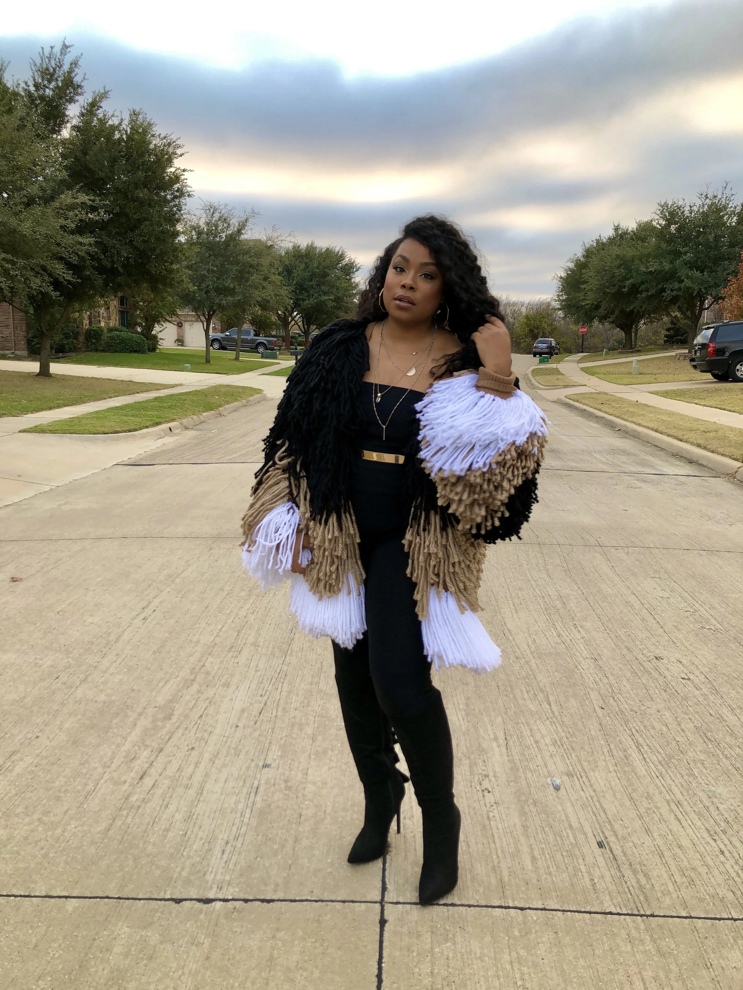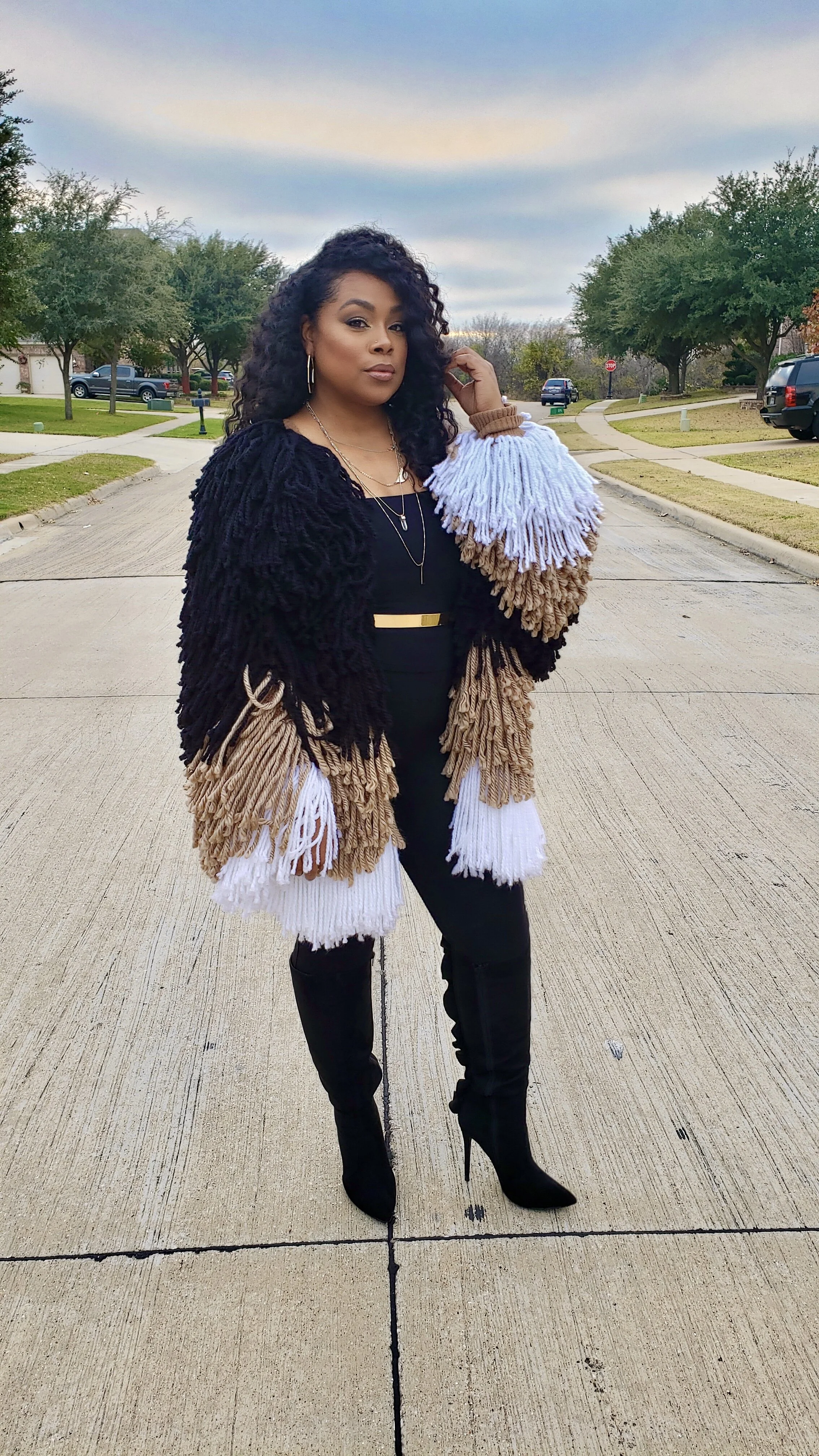 On one of my frequent Pinterest binges, a very interesting yarn fringe jacket caught my eye. I immediately hopped on Youtube to see if there were any tutorials up to follow. There were a couple of decent videos that got me started. I ended up choosing the crochet method because I’m not a fan of hot glue for projects I’m actually going to wear. I may try it one day….but not this day. Anywho, I ransacked my closet and found an old, well worn cardigan I purchased from Target probably upwards of 10 years ago. (She had definitely seen better days.) I grabbed my mask, because that’s what we do now, and I headed to Walmart for the yarn and a crochet hook.. There was so much to choose from but, I settled on colors that were similar to the vibe of the inspiration pin. Easy, in and out.